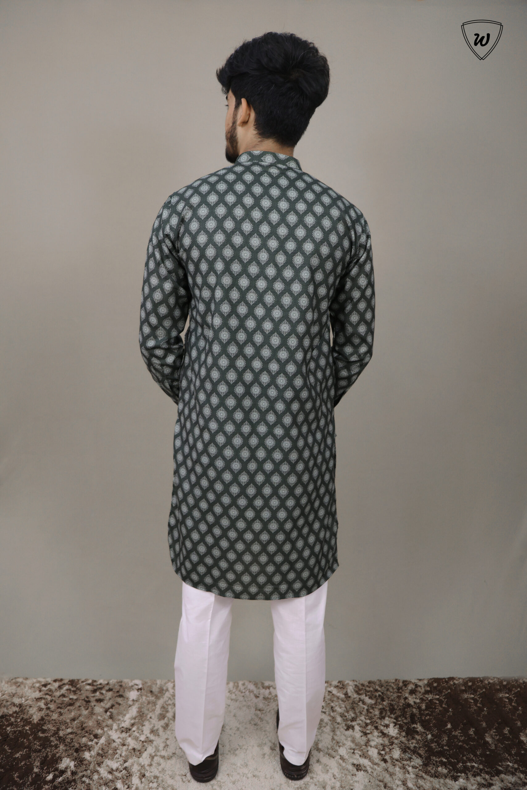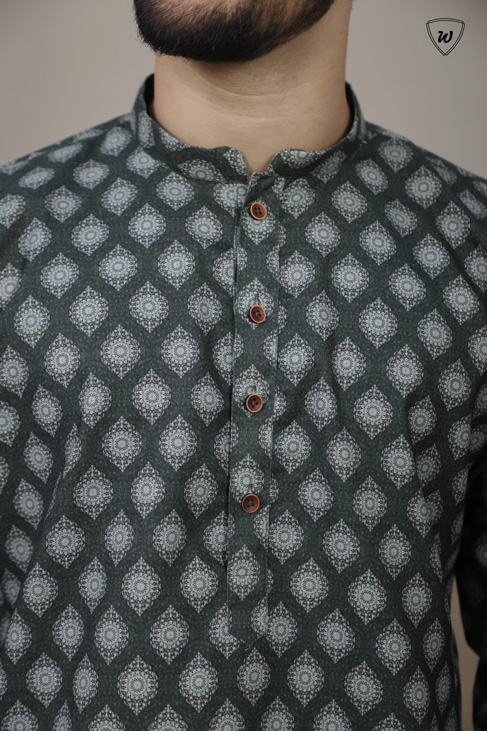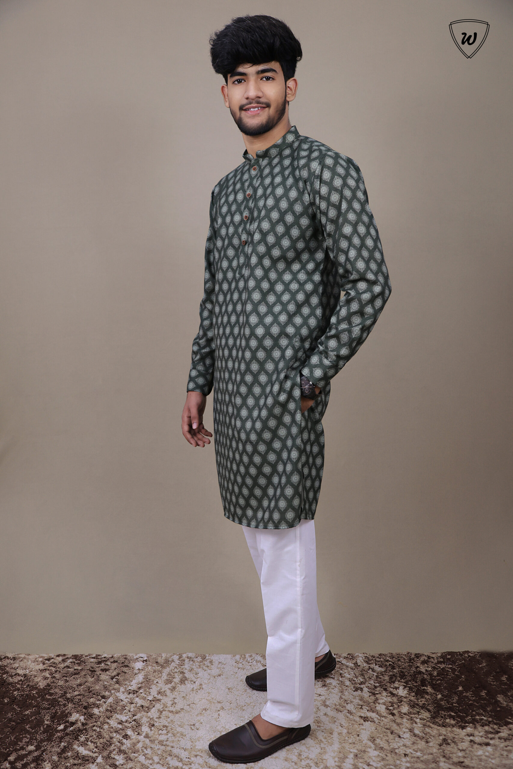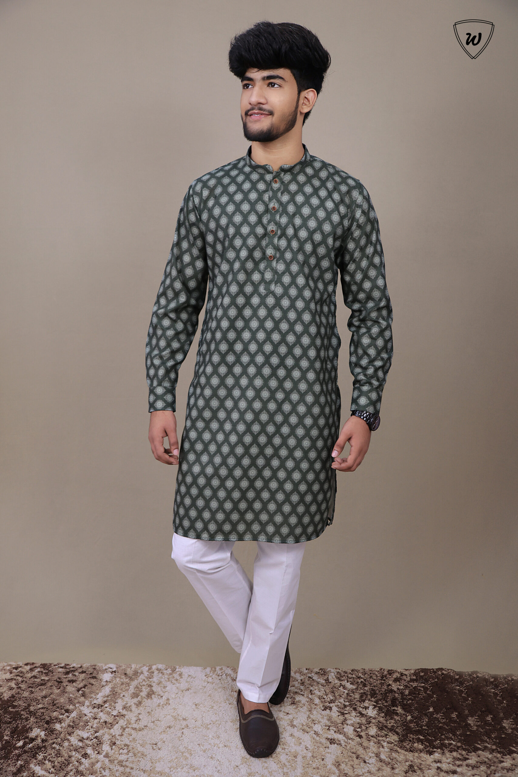 Own the night—make a statement in Westaura’s olive green printed cotton kurta pajama, crafted for those who lead with style.