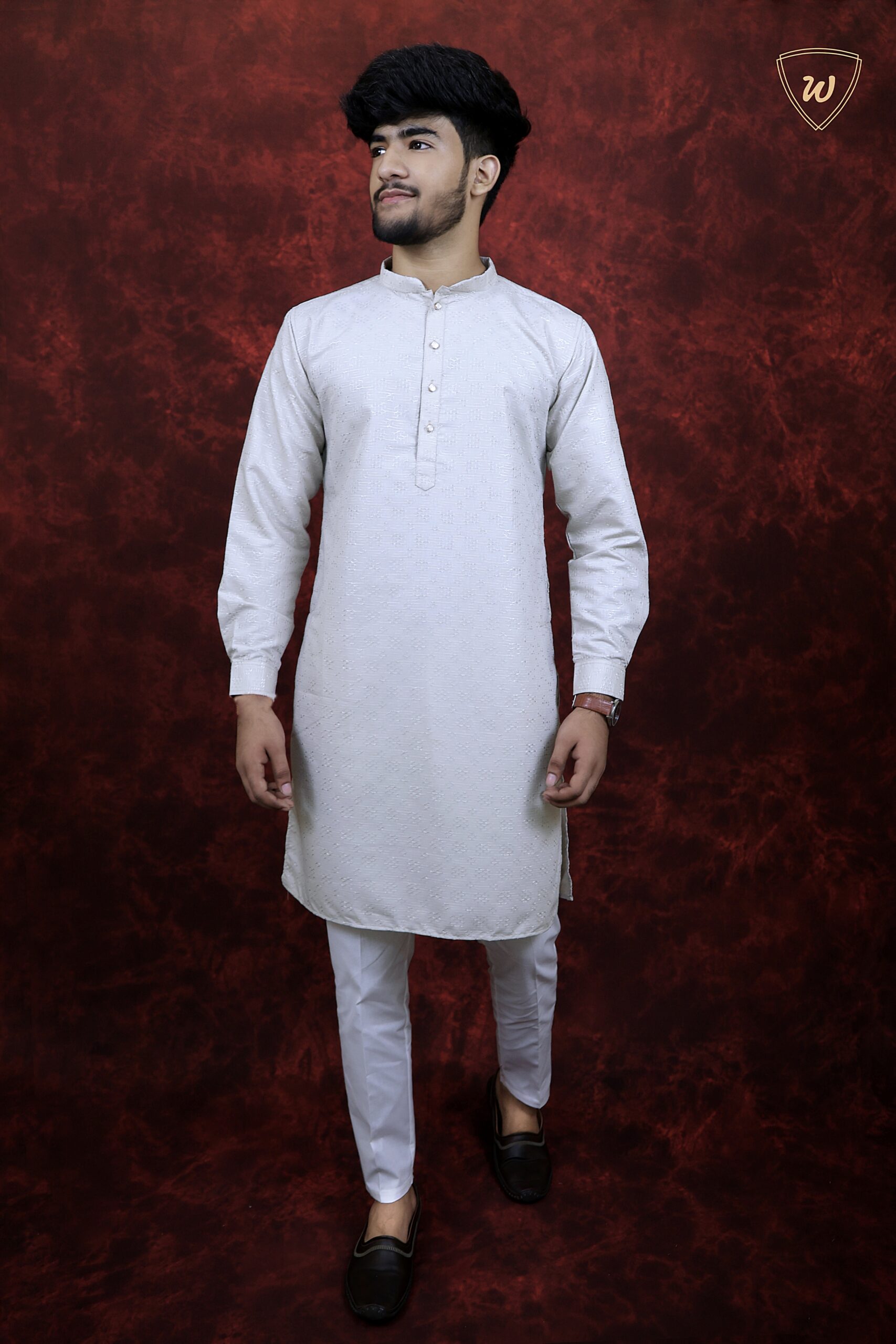 Style: Straight-fit kurta with band collar and Thread detailing paired with white pajama